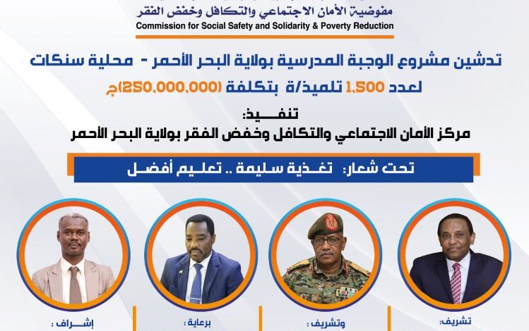 بتكلفة كلية بلغت 25000000 جنيه تدشن مفوضية الأمان الاجتماعي والتكافل وخفض الفقر صباح اليوم الأربعاء الموافق 3 ديسمبر 2025 م بمدينة بورتسودان برنامج التغذية المدرسية الذي يستهدف عدد 1500 تلميذ وتلميذة وذلك بحضور وتشريف كل من السيد / الدكتور كامل إدريس رئيس مجلس الوزراء والسيد/ الفريق ركن مصطفى محمد نور والي ولاية البحر الأحمر ورعاية السيد / الدكتور معتصم أحمد صالح وزير الموارد البشرية والتنمية الاجتماعية وإشراف السيد / الدكتور محمد علي سالم المفوض العام لمفوضية الأمان الاجتماعي والتكافل وخفض الفقر