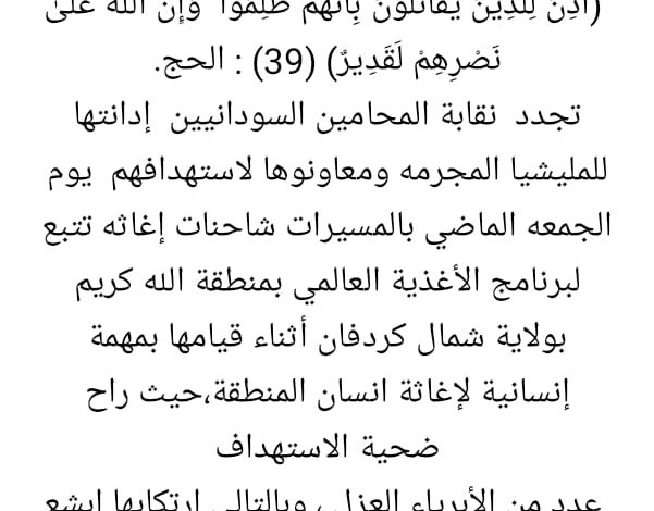 تجدد نقابة المحامين السودانيين إدانتها للمليشيا المجرمه ومعاونوها لاستهدافهم يوم الجمعه الماضي بالمسيرات شاحنات إغاثه تتبع لبرنامج الأغذية العالمي بمنطقة الله كريم بولاية شمال كردفان أثناء قيامها بمهمة إنسانية لإغاثة انسان المنطقة،حيث راح ضحية الاستهداف