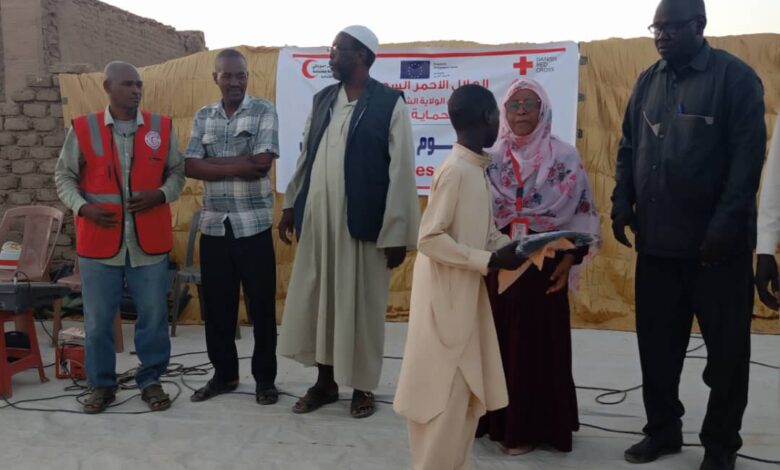 جمعية الهلال الأحمر السوداني فرع الولاية الشمالية مشروع الحماية يدشن توزيع ملابس للأطفال للنازحين بالاحتفال باليوم العالمي للاجئين .